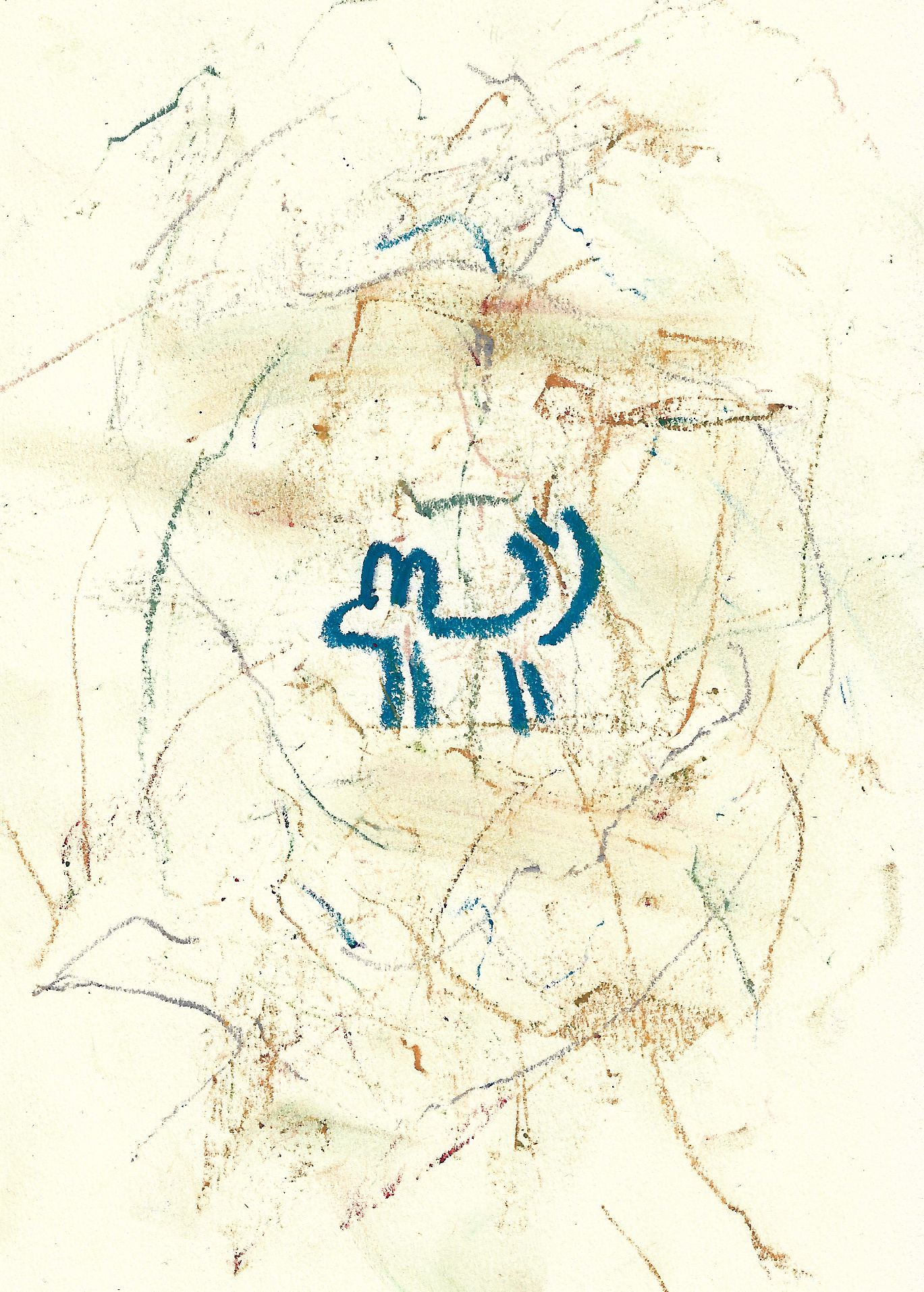 a vertical paper with smudges and streaks of random color all over. a dogthing drawn with stick legs and simplistic anatomy stands in the middle with its tail held high.