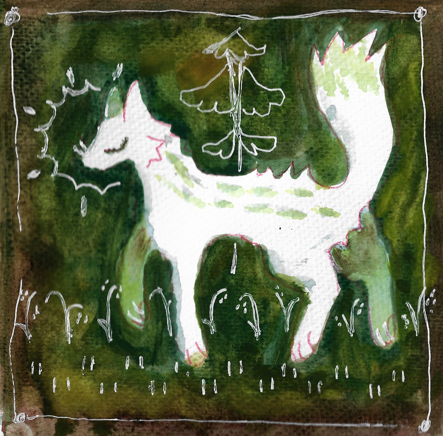 a watercolor drawing of a white dogthing in green textured backdrop. the backdrop has white lines along the edges, with hatchmarks for grass, simplified bluebell shapes, and a single stylized pine tree in the backdrop. there is a halo around the dogthing's head.