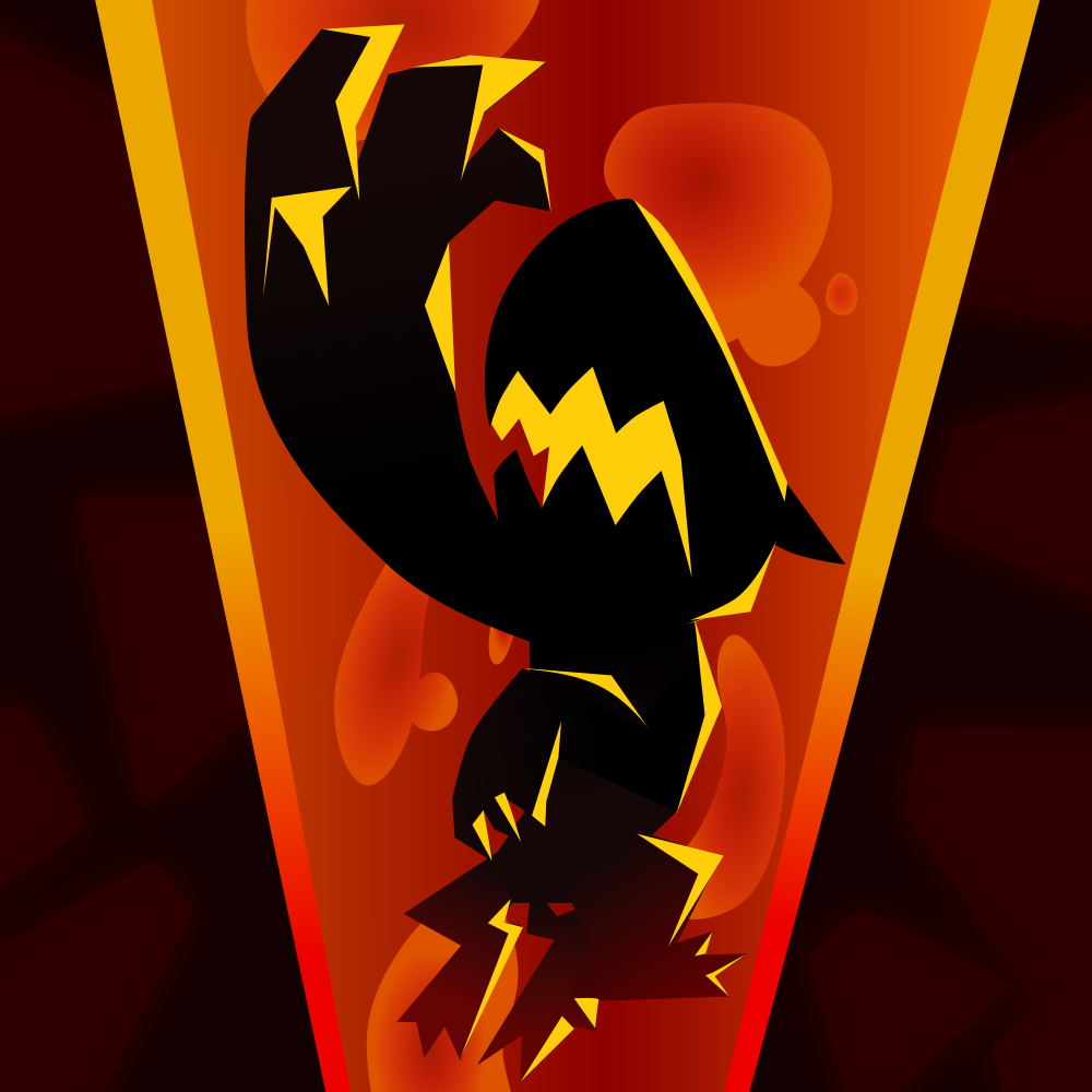a vector illustration of a dogthing experiment in a large cloning tube. it has one arm outstretched and its mouth open, as though resisting containment. the dimmed background has abstract glowing monitor squares. the color palette is reds, yellows, and oranges, but the dogthing is a distinct black silhouette.