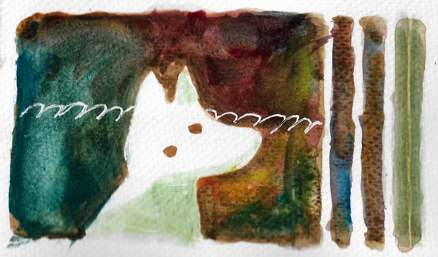 a white dogthing on watercolor paper. the backdrop is dark and vivid blues, reds, and yellows. there are three columns of miscellaneous color on the right. the dogthing has a blank expression.
