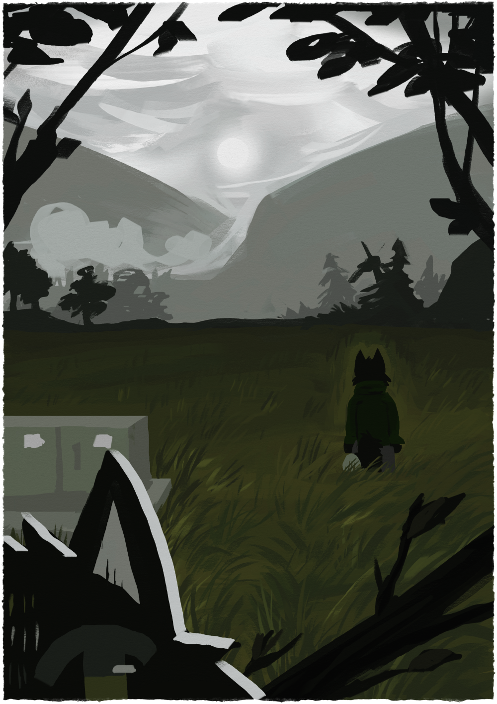 a digital painting of a black fox furry standing amidst a dim green field of grass. they are facing away from the camera with a vague light aura around them. in the distance there are two large hills and mist swirling between them, and past that, an overcast sky where the sun can still pierce through. in the foreground are branches and the same black fox furry, but facing the camera, with all but the top right quadrant of its face out-of-frame.