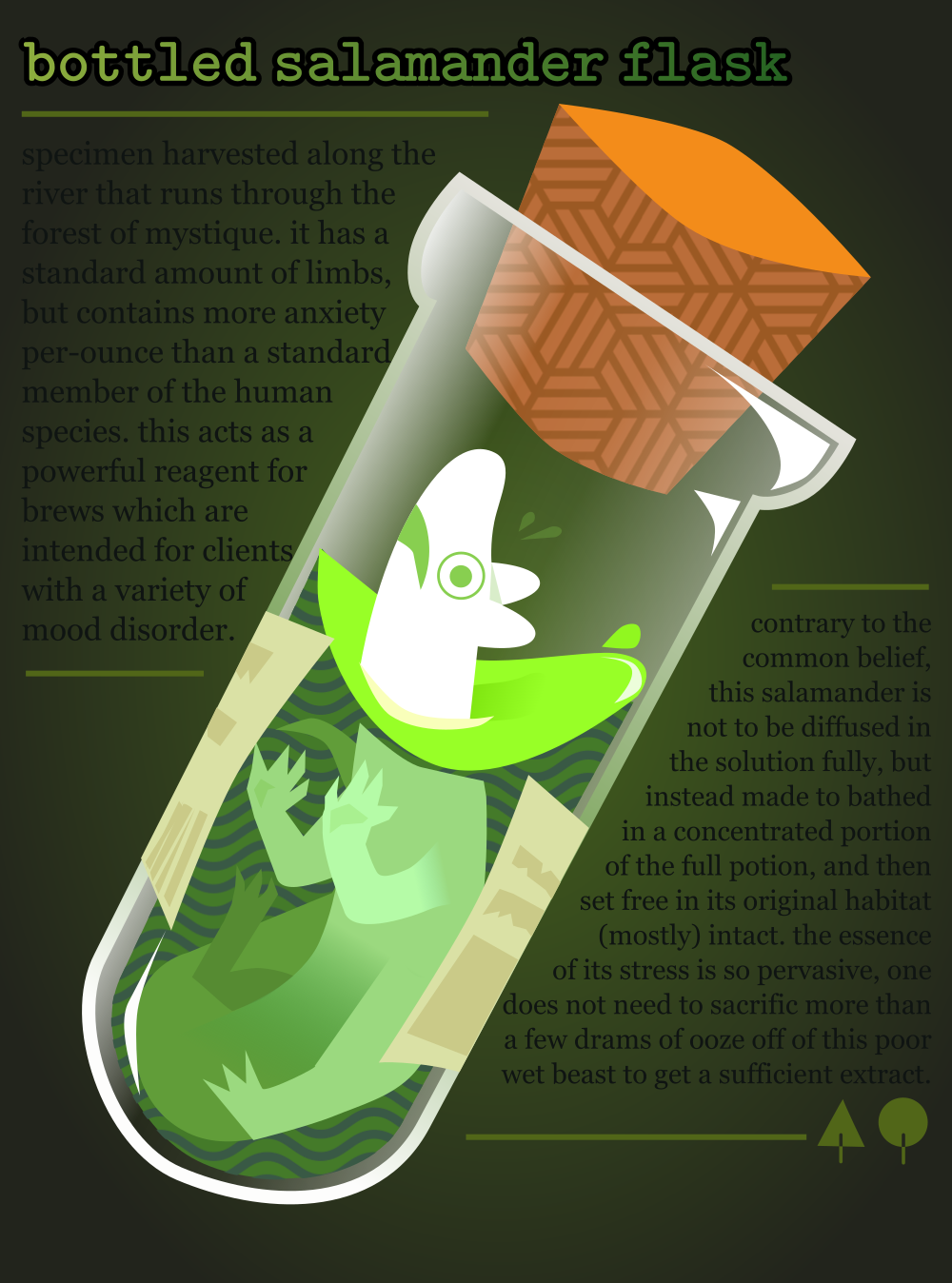 a vector illustration of a long noodly creature in a cartoonish glass vial, which is filled up to the creature's neck in a bright green fluid. there is text on either side of the vial of nervous animal. the text reads: specimen harvested along the river that runs through the forest of mystique. it has a standard amount of limbs, but contains more anxiety per-ounce than a standard member of the human species. this acts as a powerful reagent for brews which are intended for clients with a variety of mood disorder. contrary to the common belief, this salamander isnot to be diffused in the solution fully, but instead made to bathed in a concentrated portion of the full potion, and then set free in its original habitat (mostly) intact. the essence of its stress is so pervasive, one does not need to sacrific more than a few drams of ooze off of this poor wet beast to get a sufficient extract.