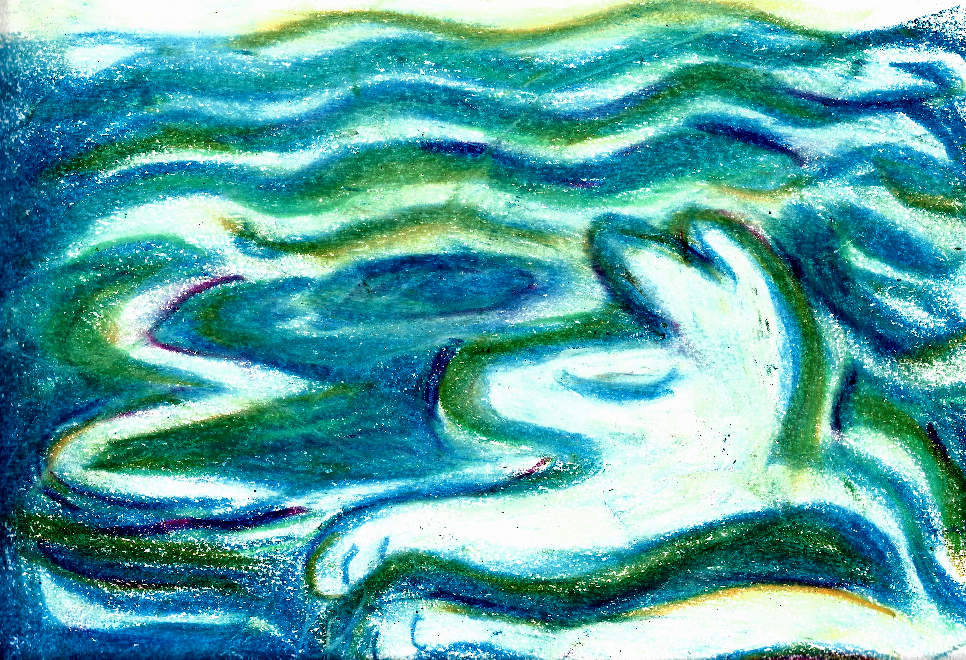 an oil pastel drawing of stylized water, with greens and blues and slight red accents. a white dogthing is weaved into the waves along the bottom right, eyes closed, as though it's sculpting the tide.