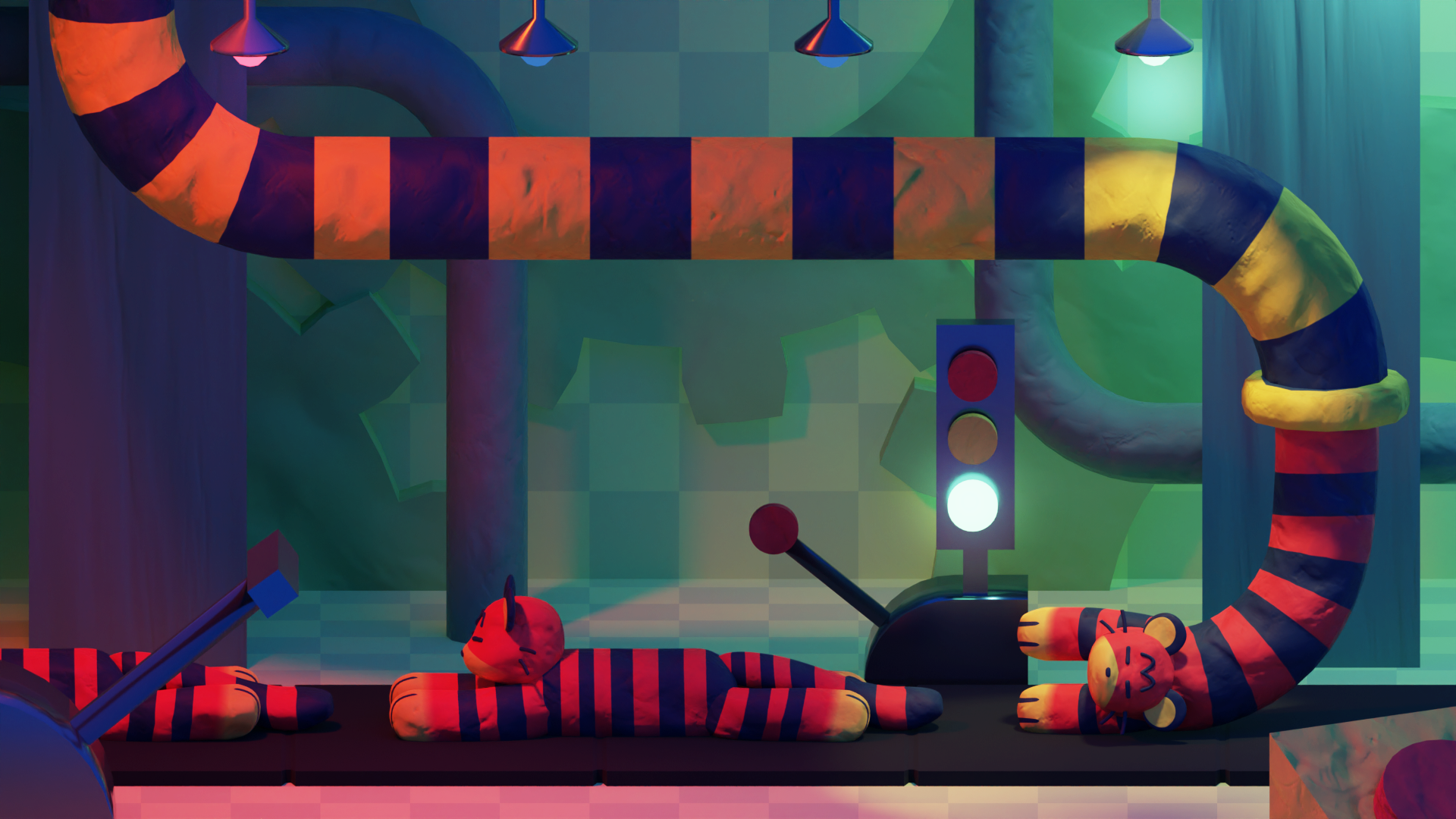 a 3d render of tigers being poured out of a striped yellow-and-blue pipe onto a gray conveyor belt. the one currently exiting the tube is cartoonishly long. other features of this image include four lamps overhead, a few different levers, and a traffic-light with a green-lit button.