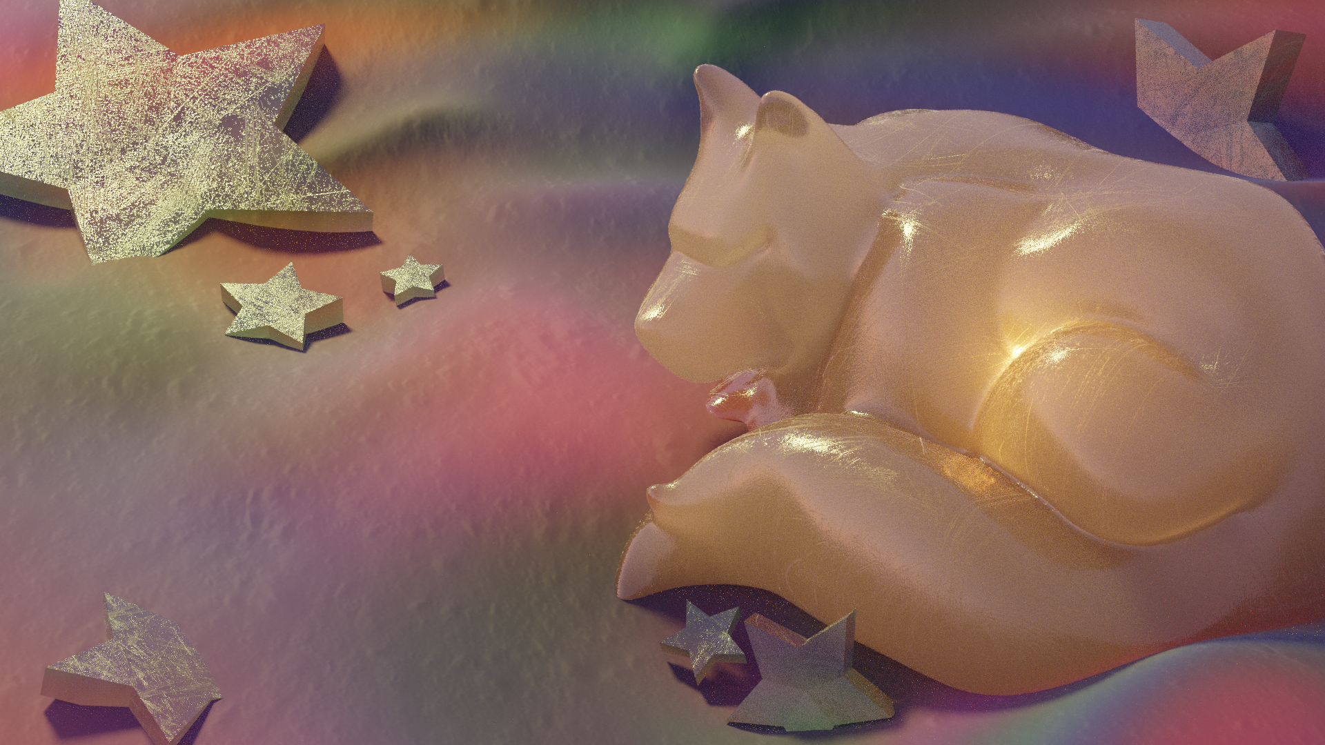 a crystalline sleeping dog carving nestles itself into rainbow sands. surrounding it are a number of stars embedded in the sand. a gold light shines from within the carved dog.